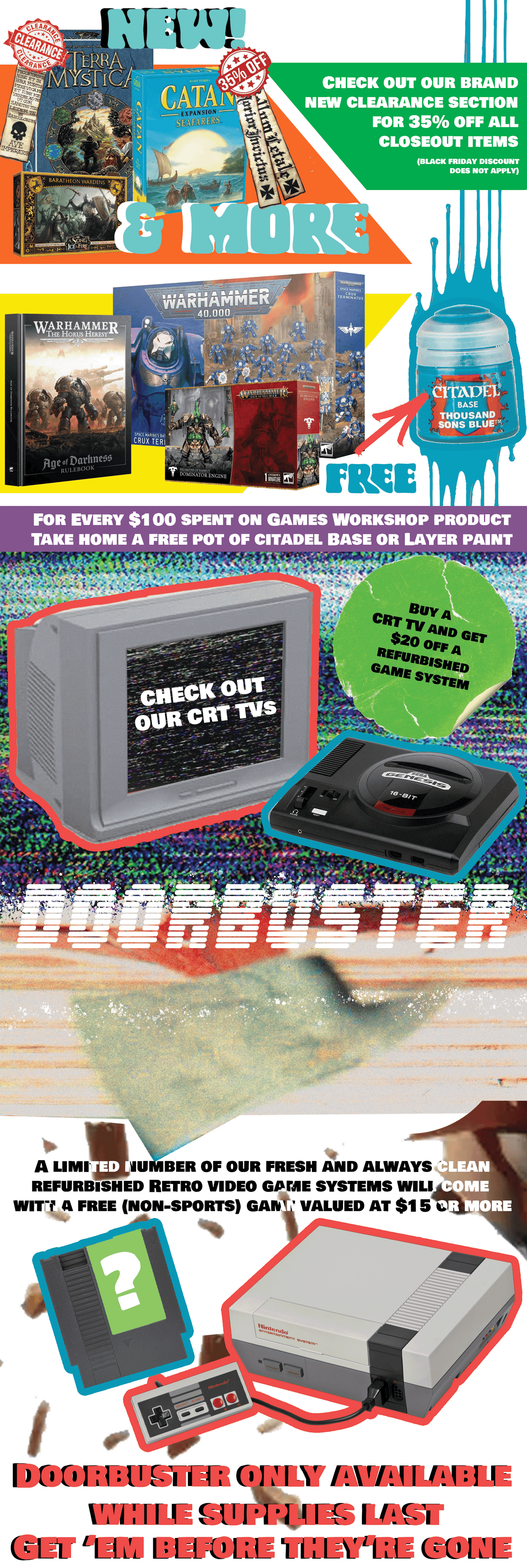 We carry the entire Games Workshop line of products at 15% msrp every day! We also carry other miniatures including AD&D minis, Bolt Action, X-Wing, Song of Fire & Ice and MORE!